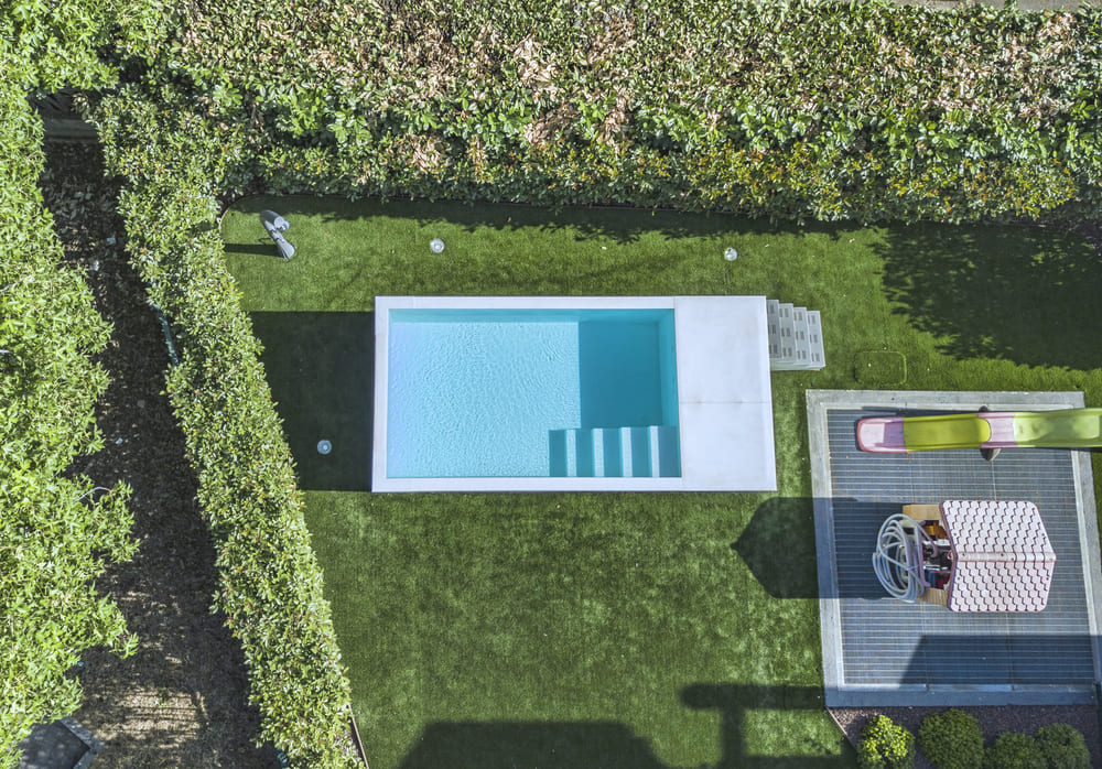 Piscina fuori terra a sfioro sottobordo nascosto, dal design elegante e minimalista.