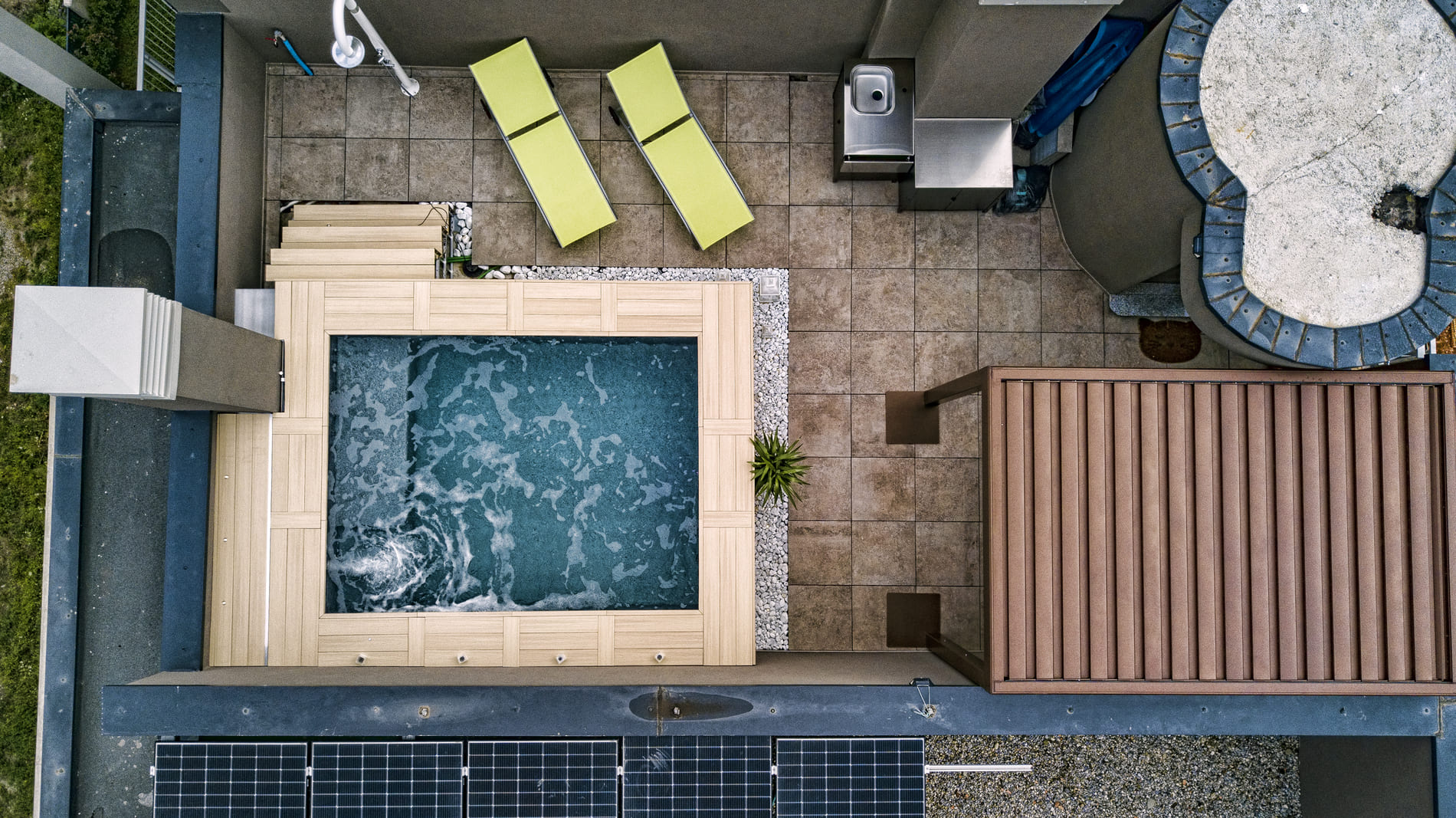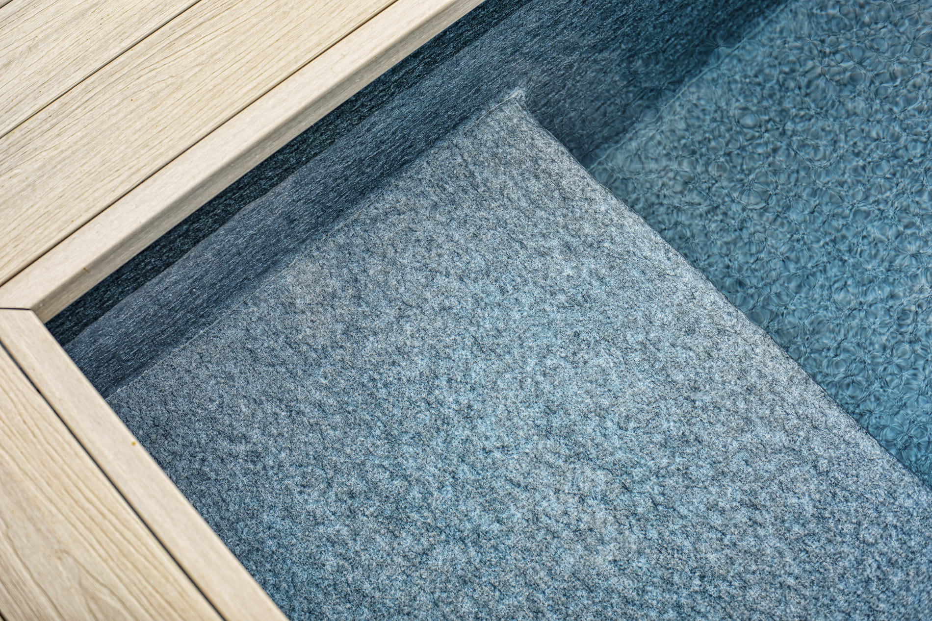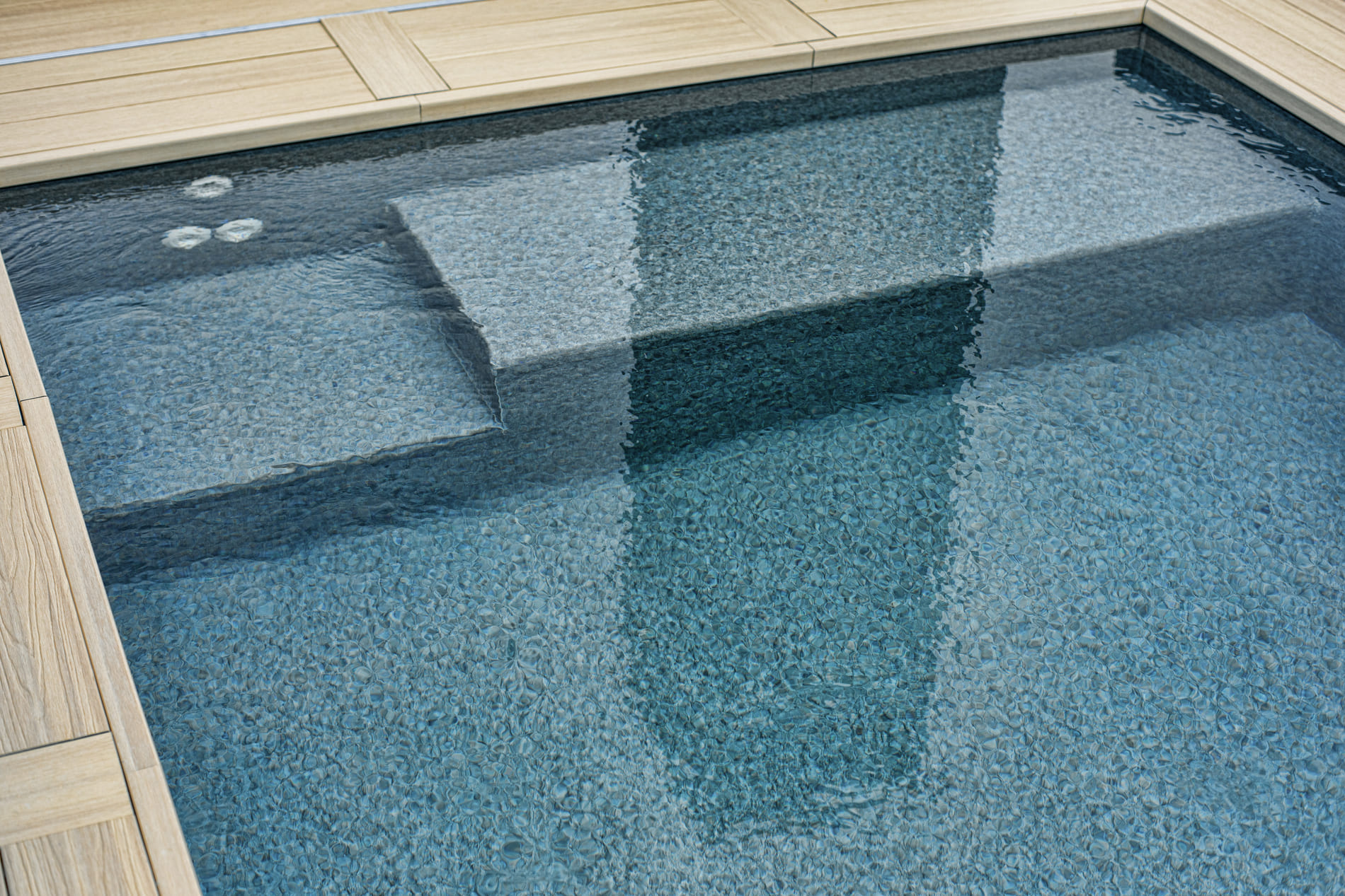 La piscina è stata personalizzata esternamente con doghe UltraShield realizzate in legno composito, una miscela di fibra di legno naturale e resine polimeriche. Questo materiale combina l’estetica del legno naturale con la durabilità e la resistenza della plastica. Una soluzione di grande pregio e che non necessita di molta manutenzione, perché estremamente resistente a scolorimenti, crepe, e agenti atmosferici.