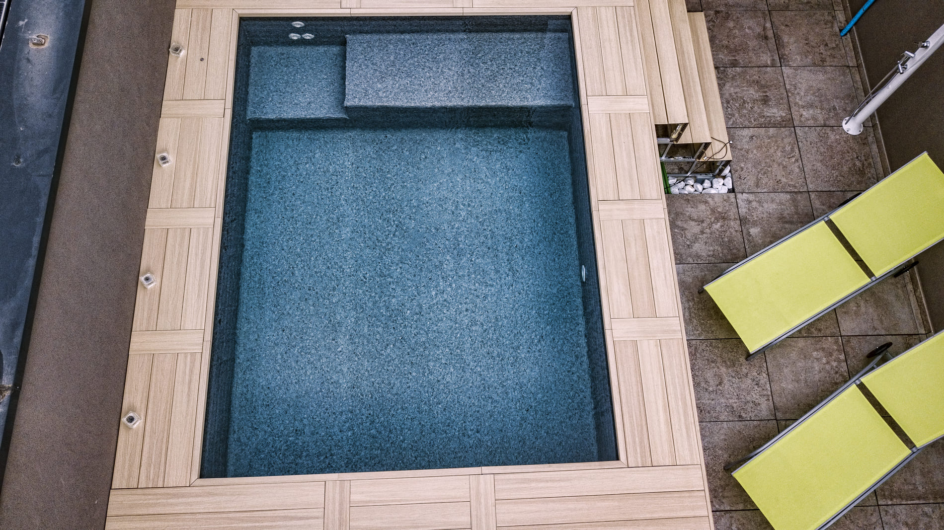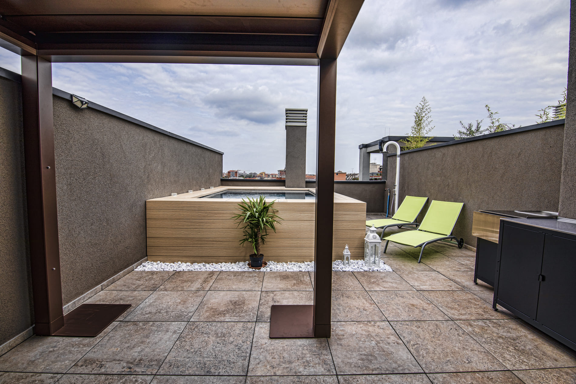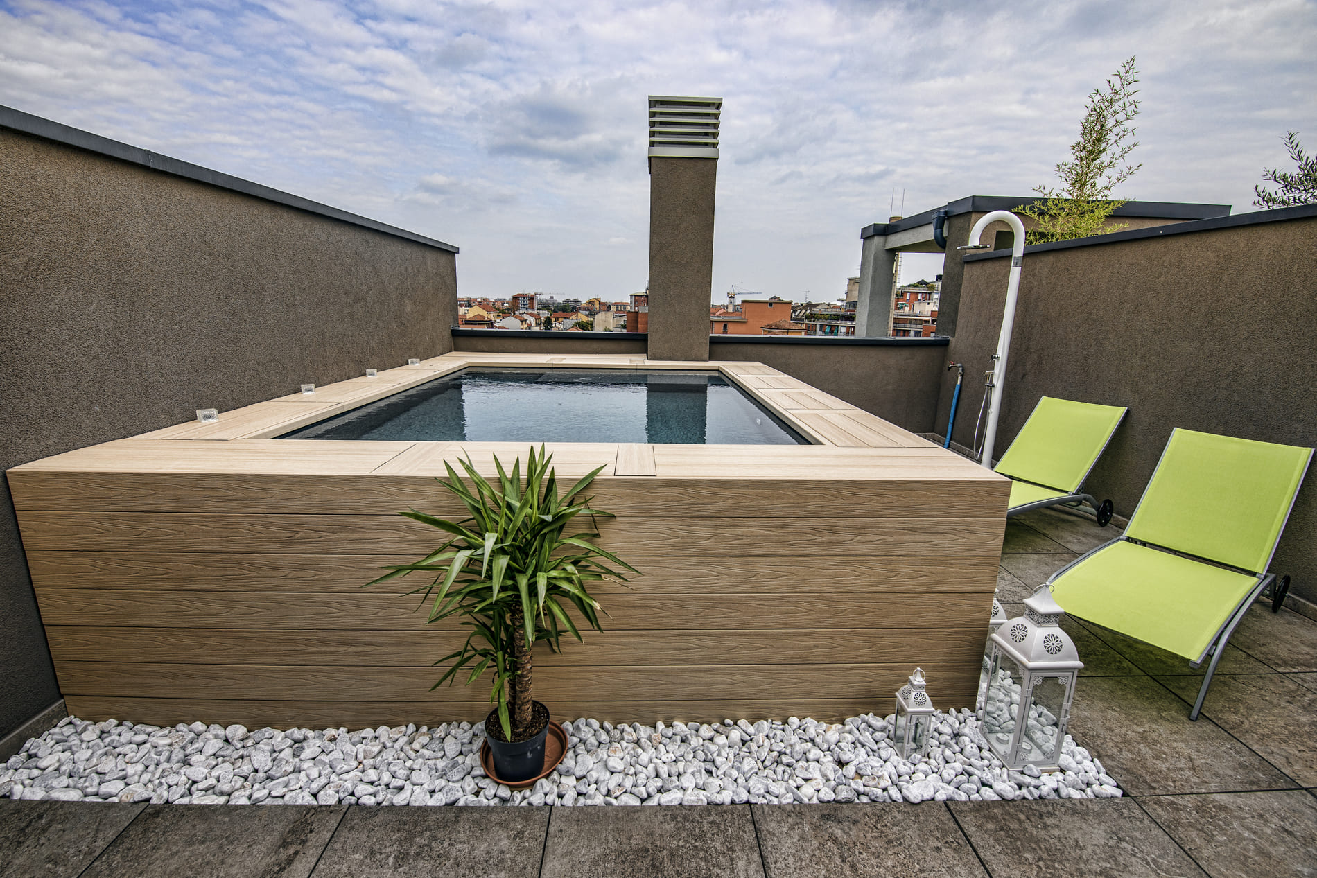 Piscina fuori terra Spatium modello RECTA posizionata sul terrazzo al quarto piano: perfetta per evadere dal caos metropolitano e rilassarsi a bordo vasca. Le dimensioni contenute la rendono la miglior soluzione per spazi interni e ambiti outdoor ridotti. È il modello che meglio si presta a personalizzazioni, anche di natura estetica.