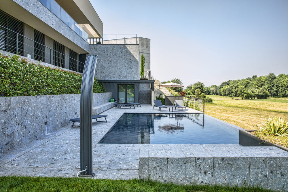 Realizzata con rivestimenti in gres effetto pietra e bordo a cascata su lato panoramico, la vasca regala un suggestivo effetto “infinito”, dove l’acqua sembra fondersi con l’orizzonte.