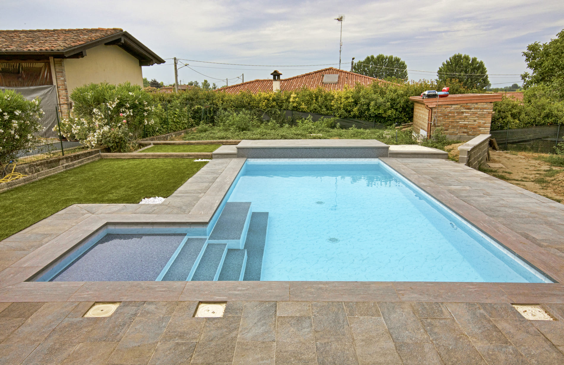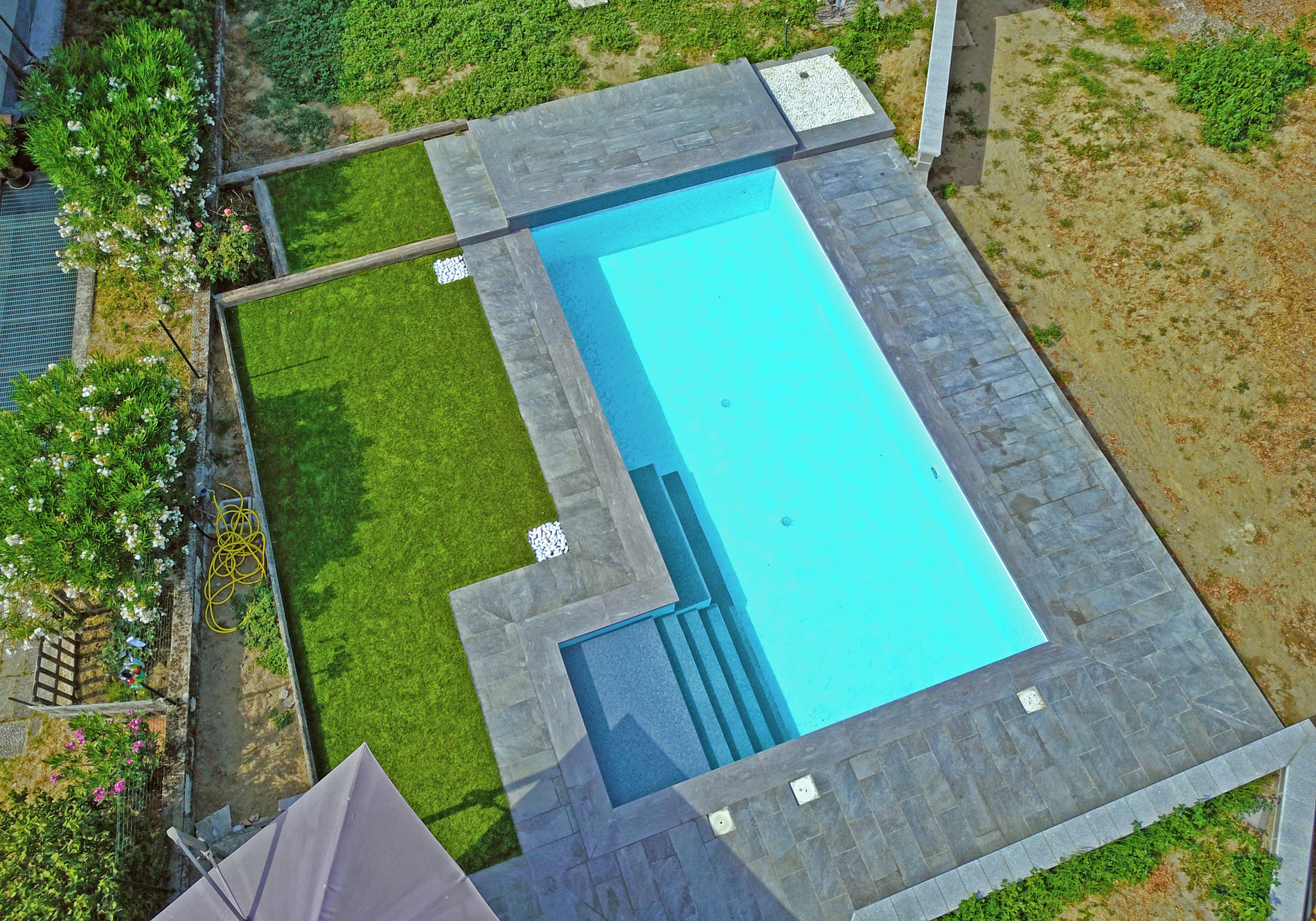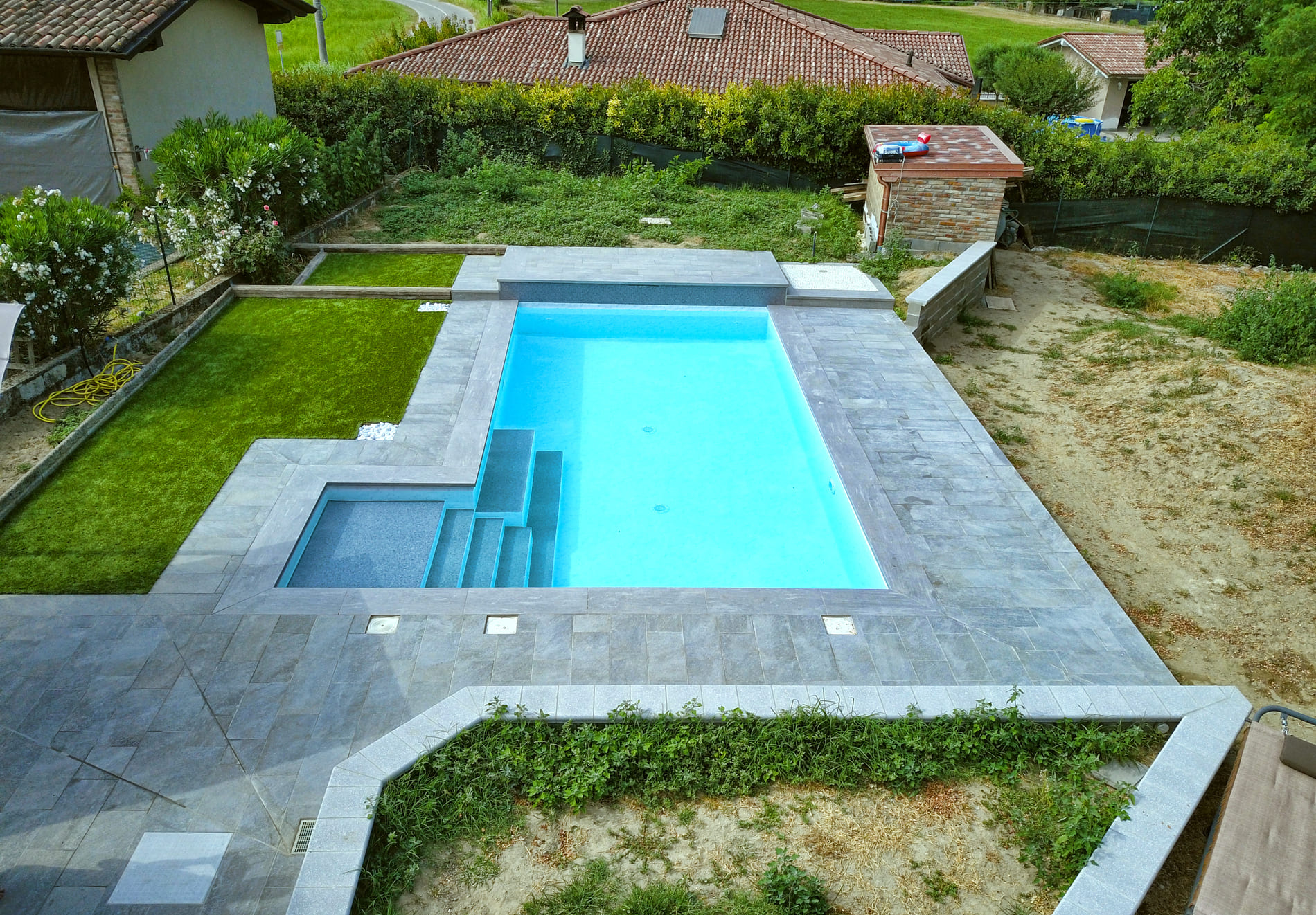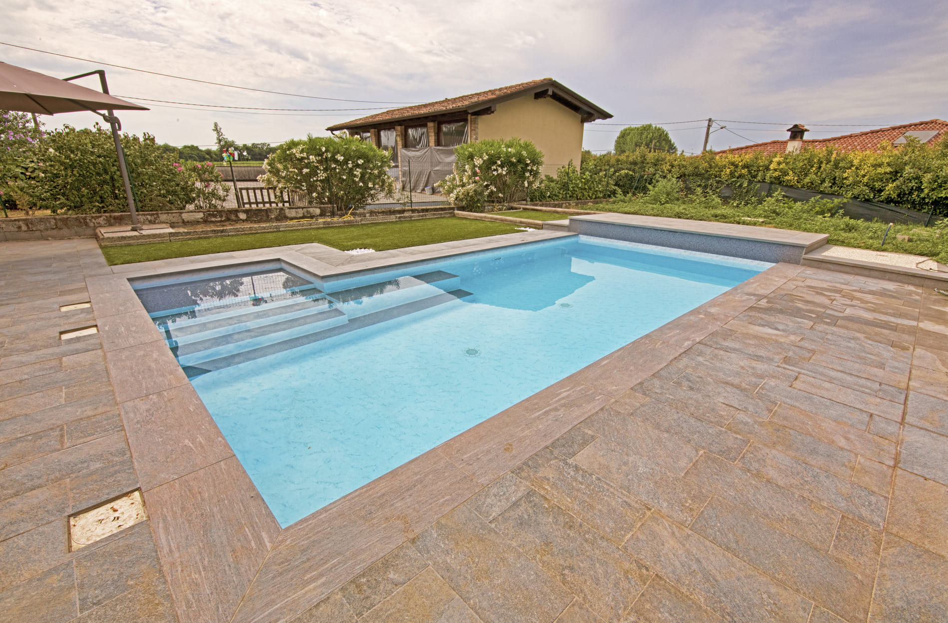 Piscina privata interrata outdoor dalla forma rettangolare, con scala recessa sul lato lungo. La struttura della vasca di 8x4m è stata realizzata in casseri EPS ed ha una profondità costante di 1.5 m. Il sistema di ricircolo è a skimmer.