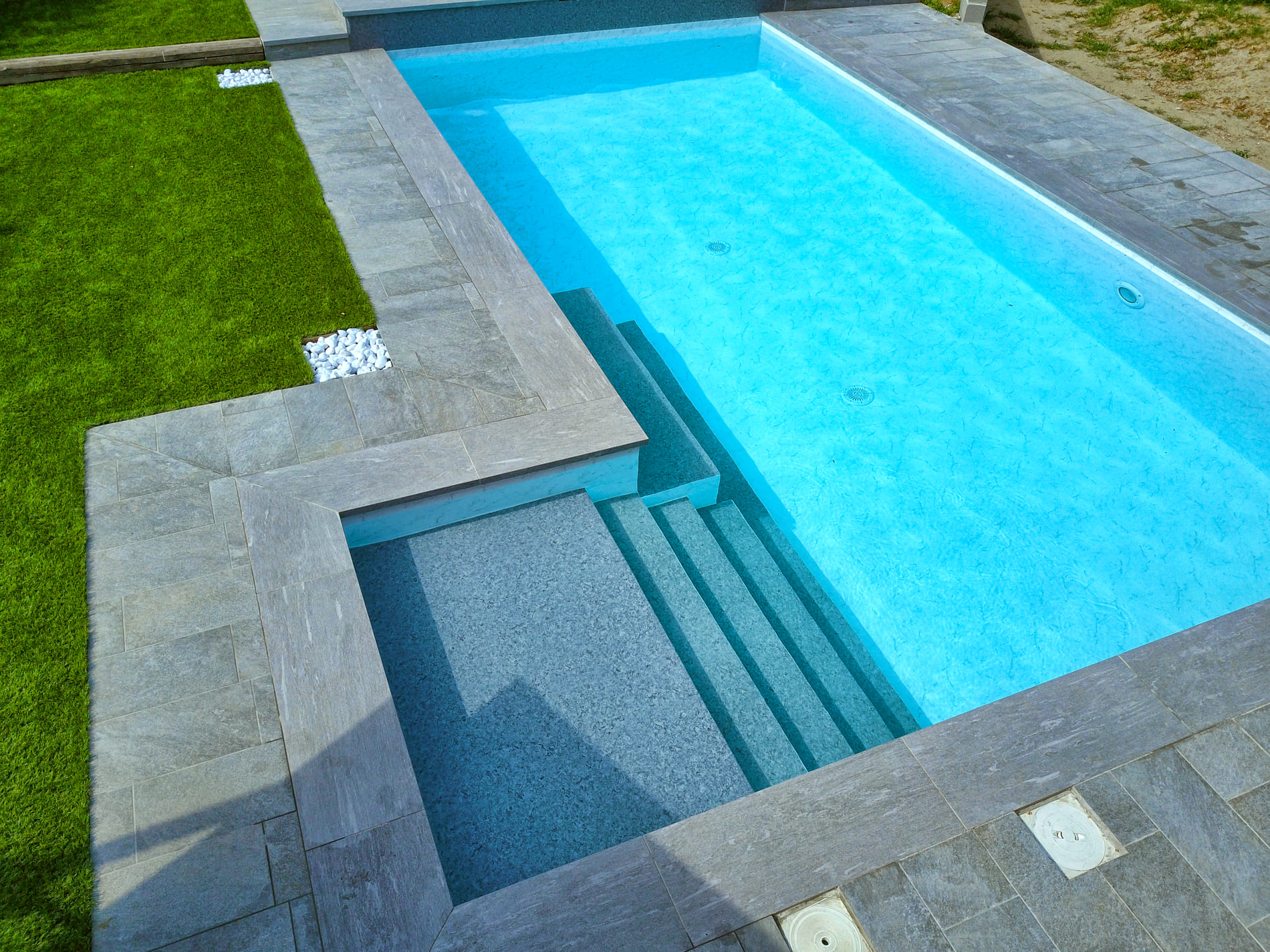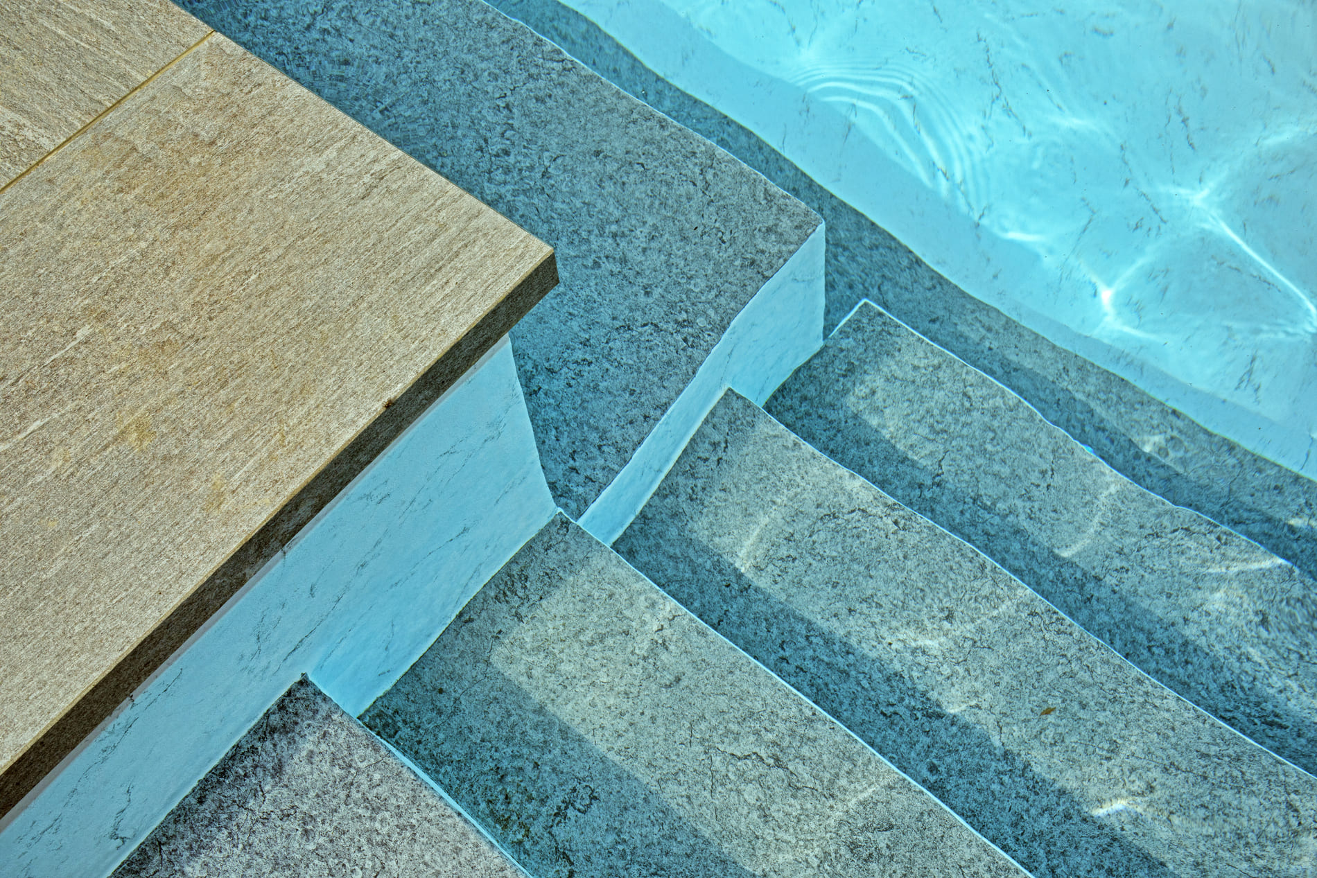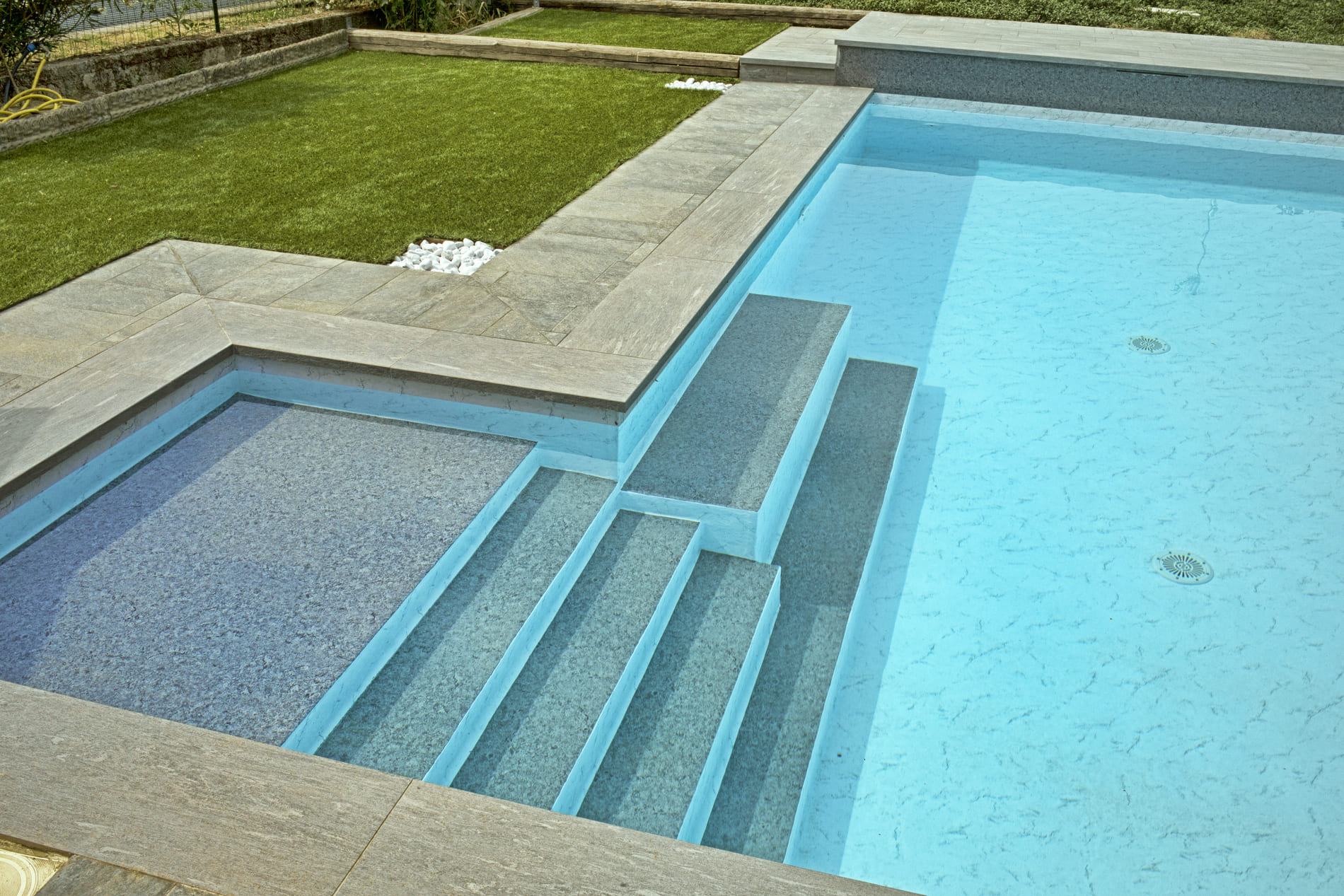 La piscina è stata rivestita con membrana armata della linea STONEFLEX Royal effetto marmo, di grande effetto estetico. Ad impreziosire il colpo d’occhio, la superficie degli scalini e l’ingresso, rivestiti con il liner TOUCH Elegance della gamma RENOLIT ALKORPLAN TOUCH. Il primo gradino della scala è più largo per rendere ancora più piacevole l’ingresso in vasca e consentire di ammirare la piscina in tutta la sua bellezza, diventando zona conviviale e di relax.