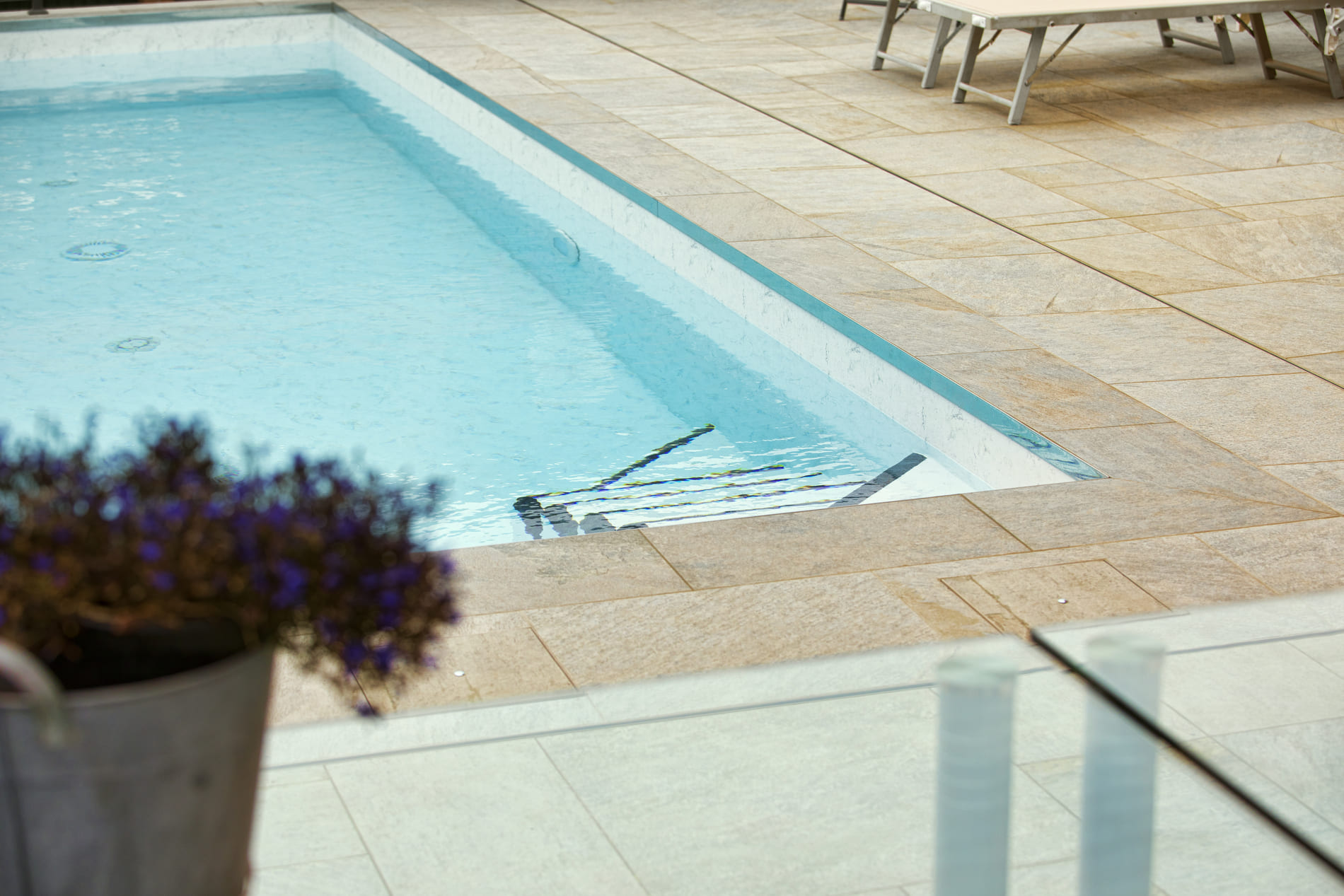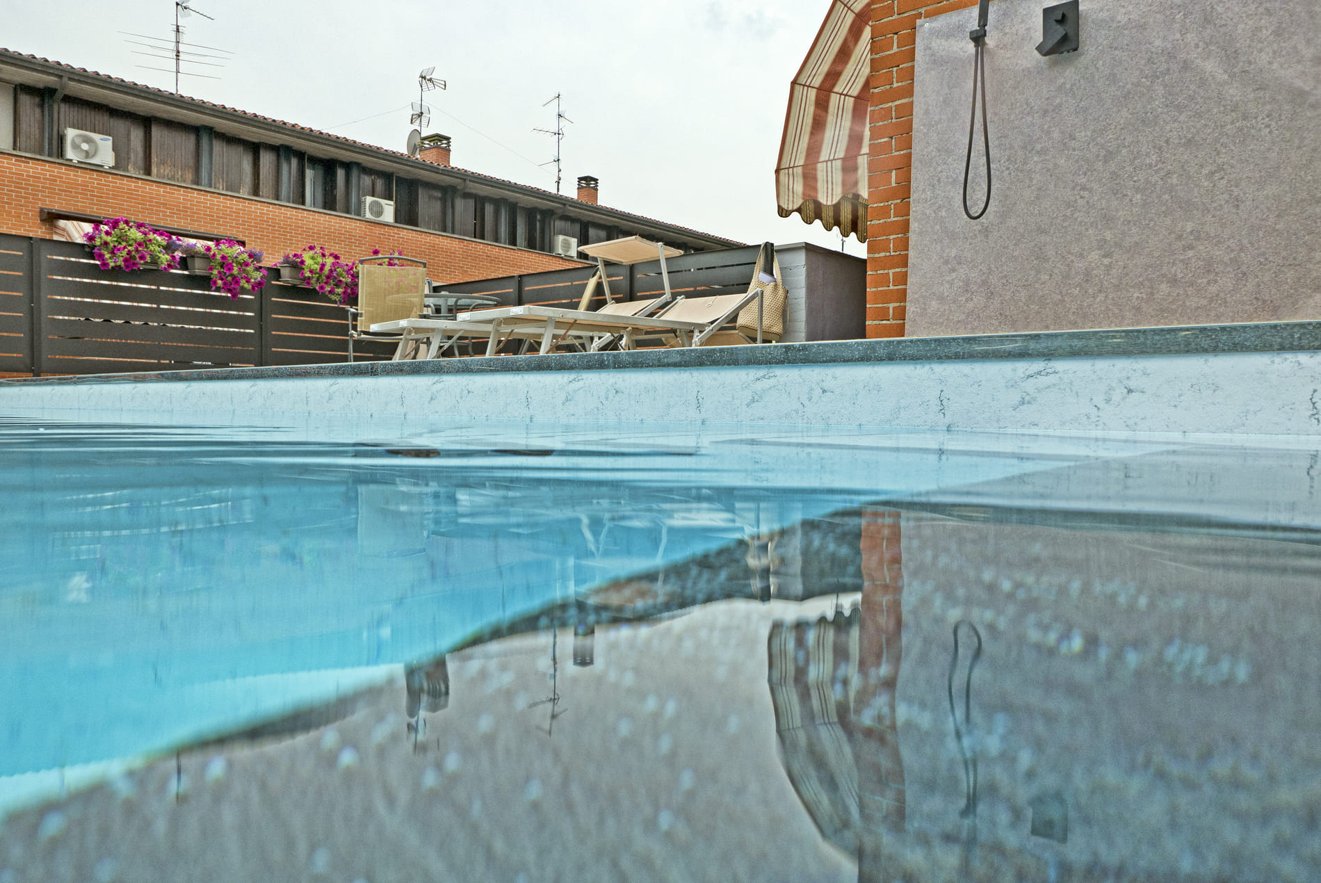 La piscina è stata rivestita con membrana armata della linea STONEFLEX Royal effetto marmo, di grande effetto estetico. L’eccezionale resistenza all’azione dei raggi ultravioletti e all’aggressività dei prodotti chimici, fanno di StoneFlex un prodotto molto facile da pulire, con un aspetto particolarmente naturale, e con eccellenti doti antiscivolo. StoneFlex è garantito 15 anni contro le perdite, 5 anni dallo scolorimento da cloro, 5 anni di resistenza alle macchie e fino a 35 C° di temperatura.