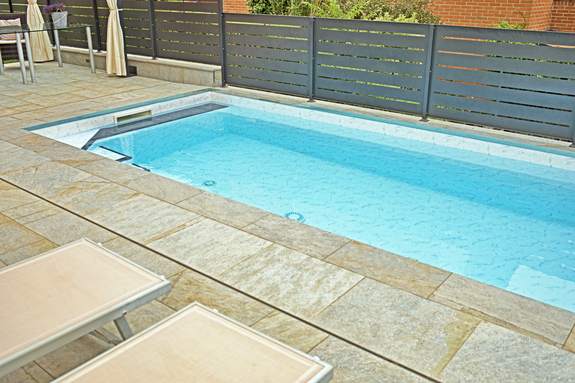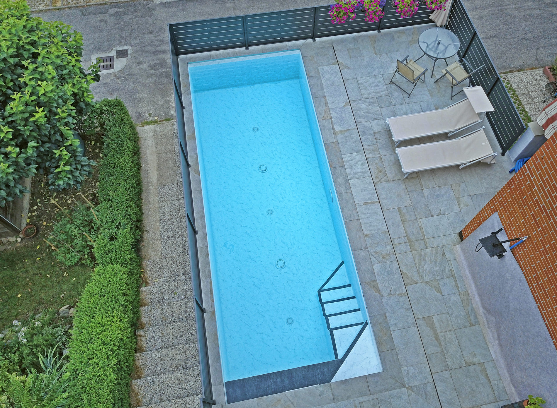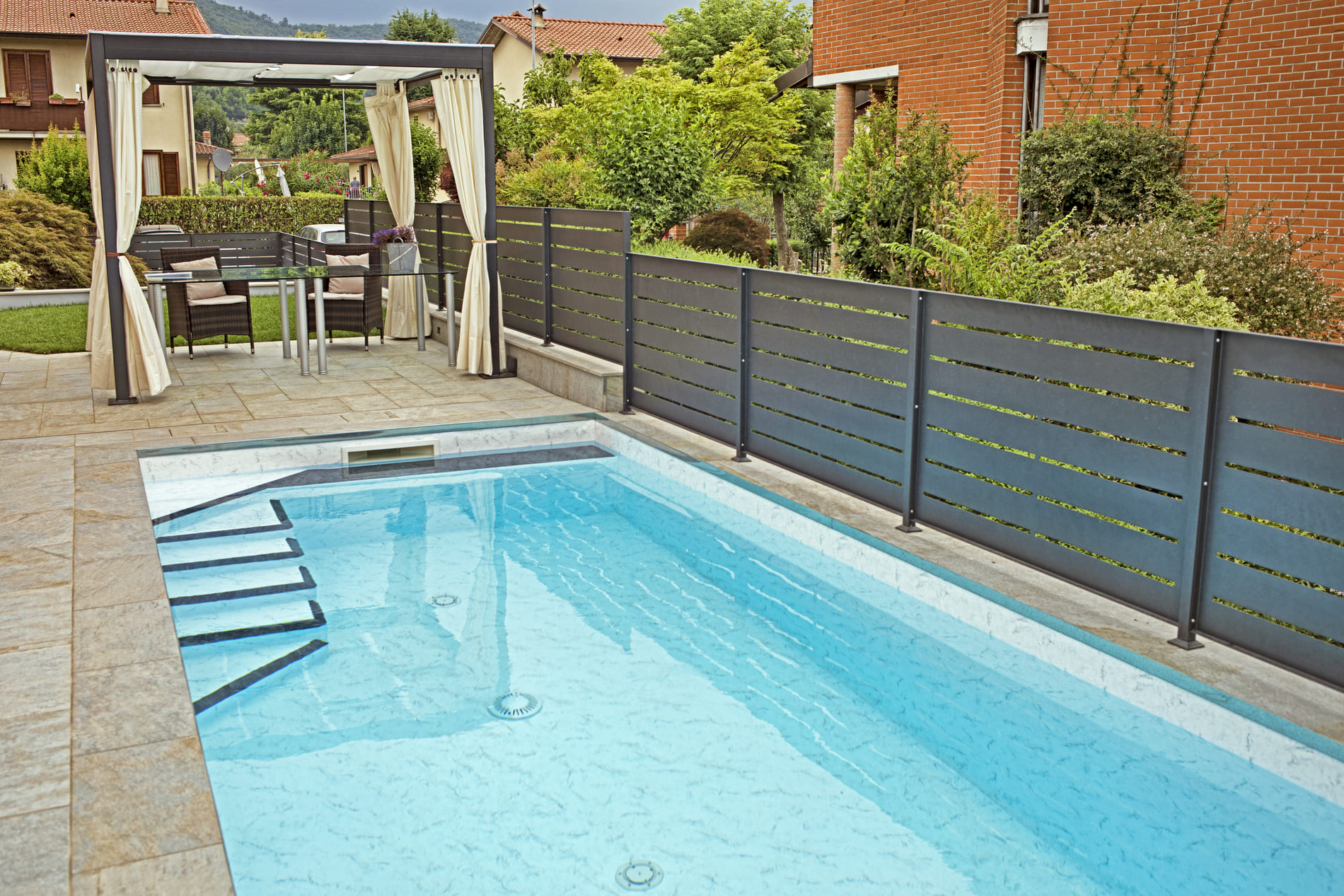 Esempio pratico di come poter ricavare una piscina anche in assenza di spazio sufficiente in giardino. Piscina privata interrata outdoor dalla forma rettangolare. La struttura della vasca di 7x3m è stata realizzata in cemento armato ed ha una profondità costante di 1.5 m. Il sistema di ricircolo è a skimmer.
